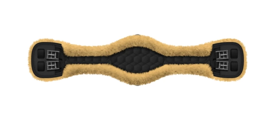 The dressage girth has an anatomical shape with the softest washable sheepskin. The anatomical saddle girth is designed to allow the horse full freedom of movement, the soft sheepskin reduces the risk of chafing and means that the horse is not hindered in its movement. The dressage girth is made of quilted textile and both saddle girth and sheepskin are machine washable.