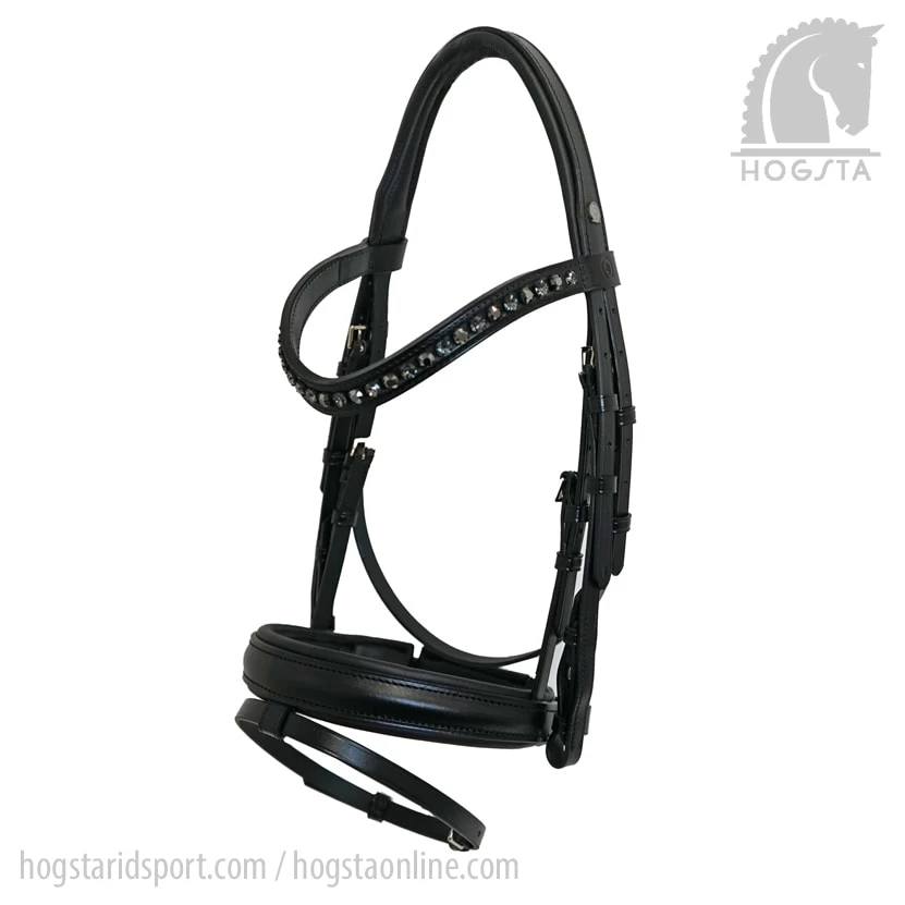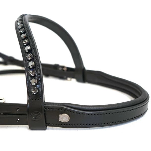 The bridle Black Line has buckles in stainless steel and an arched browband with authentic swarowski crystals (8 mm) in the color Jet Hematite and Silver Night, framed in black metal.