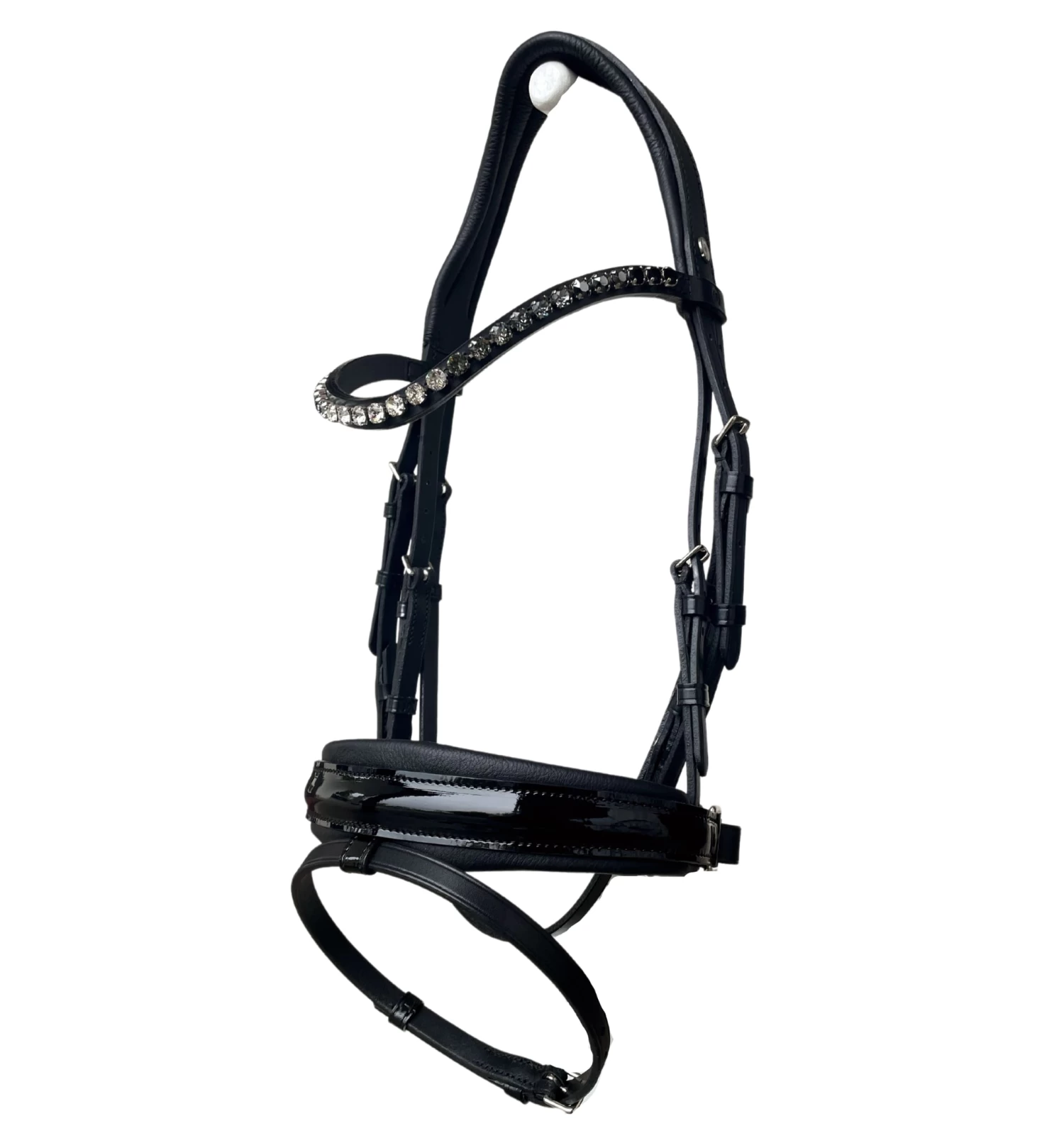 The beautiful bow-shaped browband is decorated with superimposed 8 mm large genuine Swarovski stones Rivoli in Crystal shading (black on the outer edges to crystal in the middle).
