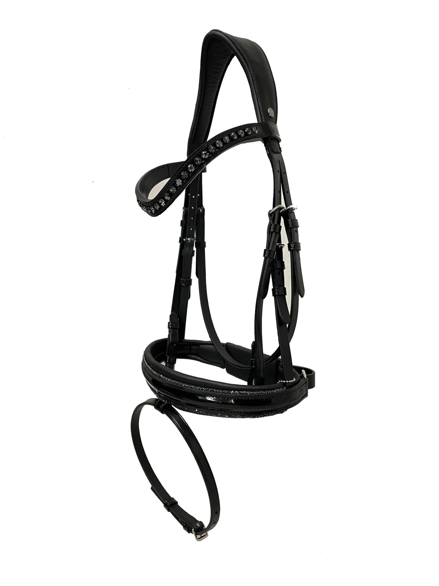 The noseband is lacquered on the outside and has fine fineline piping in sparkling Swarovski crystal, silver shade.