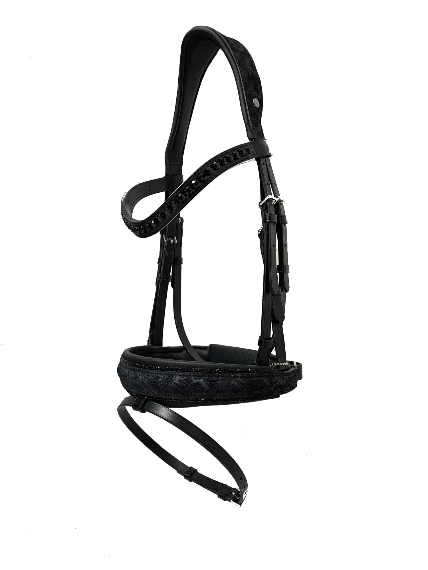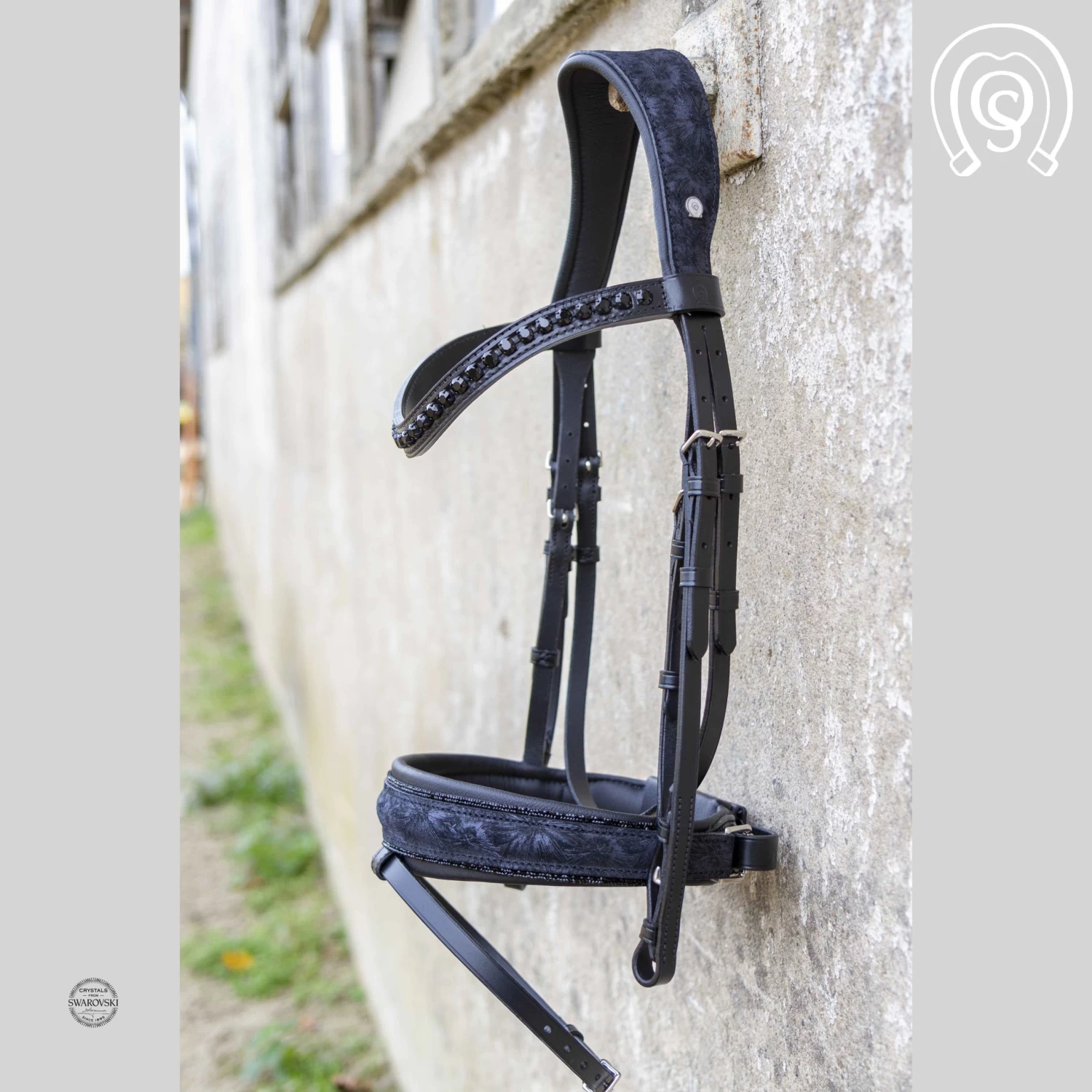 Both the neckpiece and the noseband have the decorative Magarete leather on the outside and the noseband also has fineline piping in black sparkling Swarovski crush.