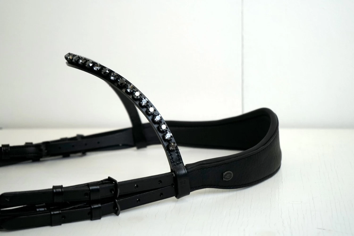 The noseband also has stunning details in form of the decorative leather “Glitter Wave” on the outside and a Fineline piping in black sparkling Swarovski crystals. The beautiful bowshaped headband is decorated with 8 mm real Swarovski stones, where every other stone is in the color Jet and every other is in Silver Night. All the buckles and setting of the stones on this bridle are in back, which makes it very discreet.