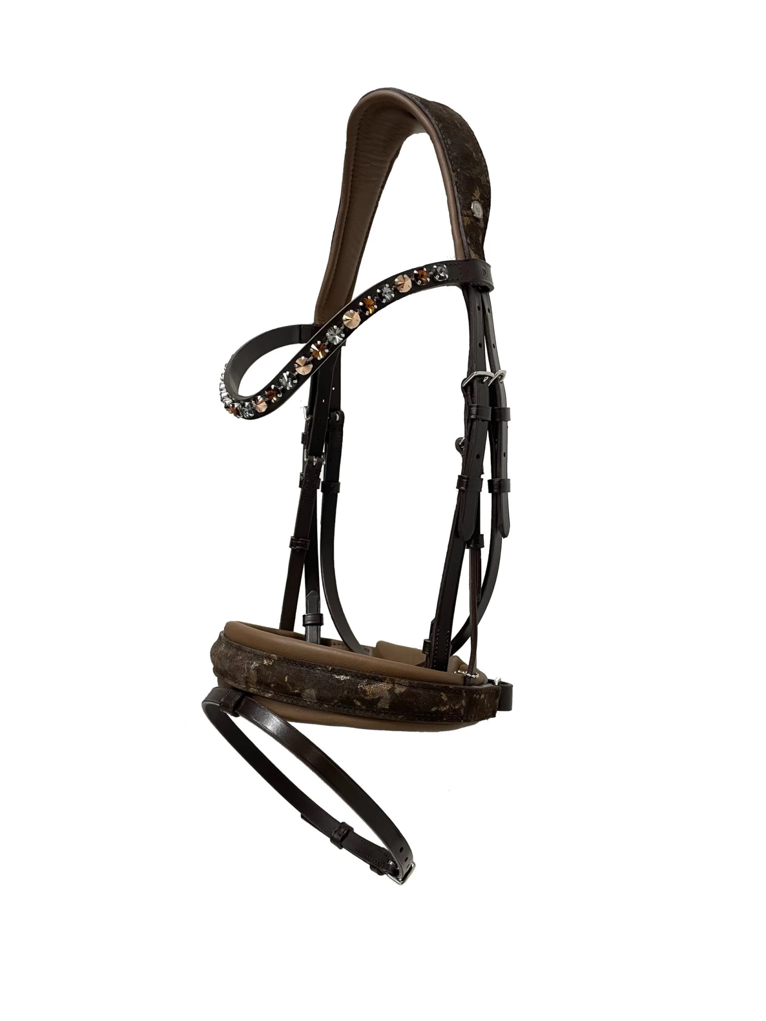 This is a beautiful bridle in the model Tokyo that has a wider, softly padded ergonomic neck piece, the noseband is a buttoned back Comfort XS model with extra wide cappuccino colored padding making this bridle something very special. The print on the muzzle and neck in grey/bronze metallic makes this bridle completely unique.