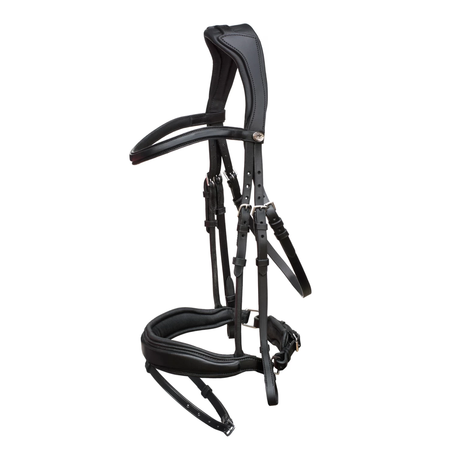 The neck piece of this bridle is designed to accommodate the ears and reduce pressure on the sensitive area of the neck. The bridle Stanford comes with two slightly curved browbands, where one is a plain black and the other has a row of glittering stones. This makes it easy to change the look of the bridle, from a nice everyday bridle to a bridle for show and competition.