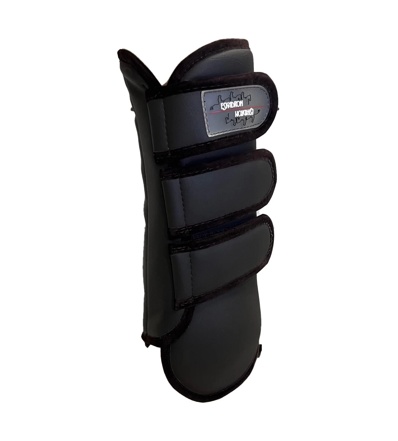 Brushing boot with artificial leather on the outside and neoprene on the inside, closed with three strong Velcro straps. The back leg brushing boot measures 27,5cm at the back.