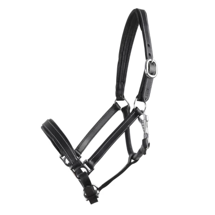 An elegantly padded leather halter from Hansbo with narrow straps, white stitching and metal buckles. This nicely fitting leather halter is available in brown or black. Adjustable noseband. Available in size Pony – X Full