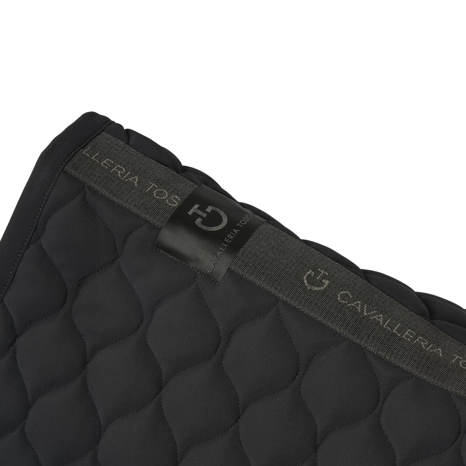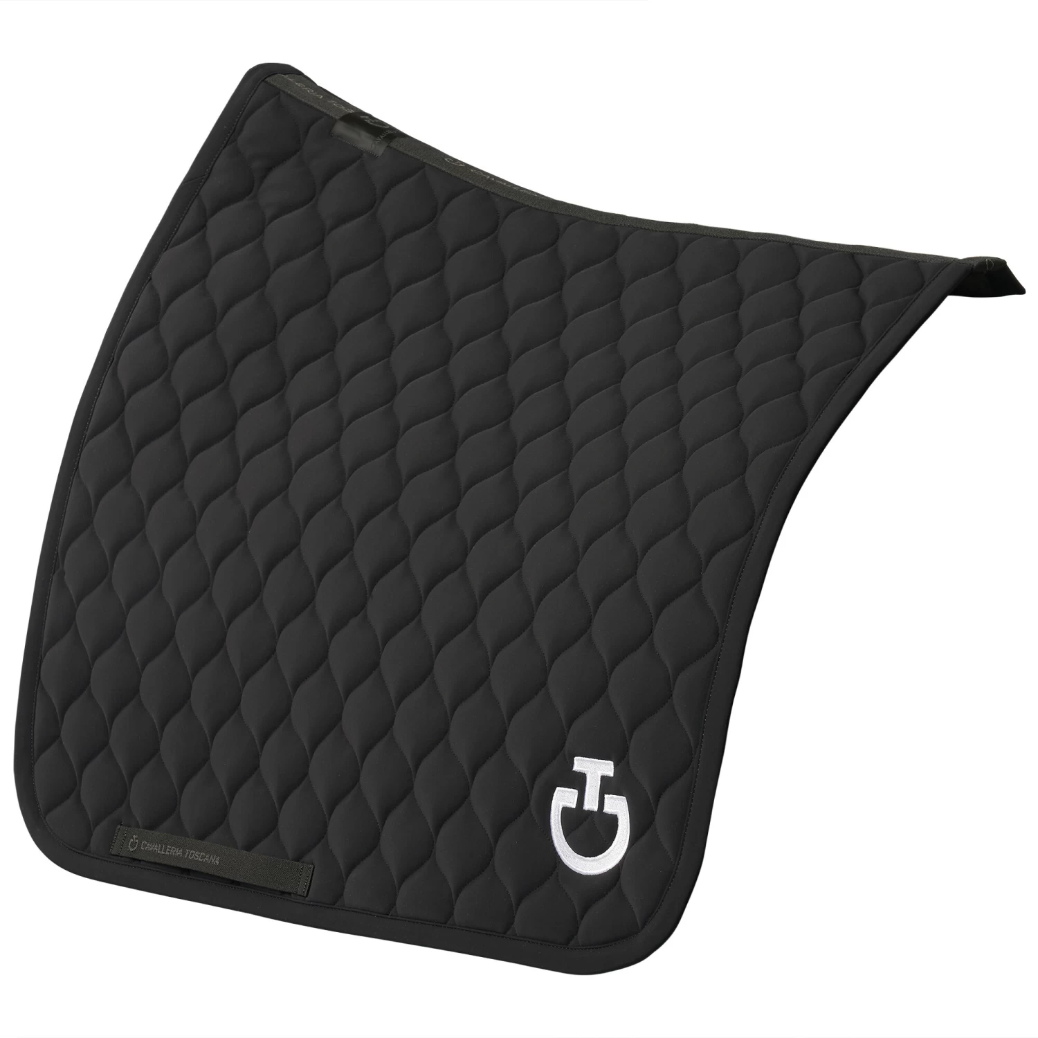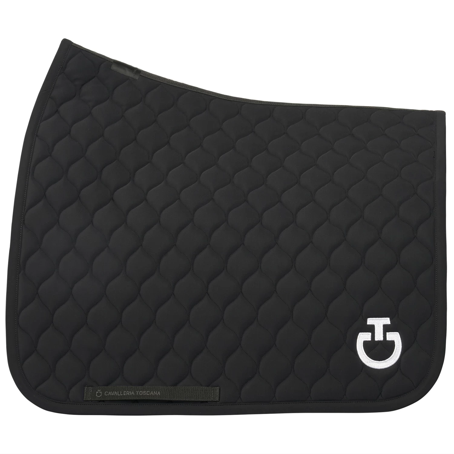 This dressage saddle pad from Cavalleria Toscana is stylish and elegant with smaller quilted circles. The Circular Quilted Jersey dressage saddle pad is in a stylish black color and has a white CT logo and a black channel in the back with Cavalleria Toscana branding there as well.