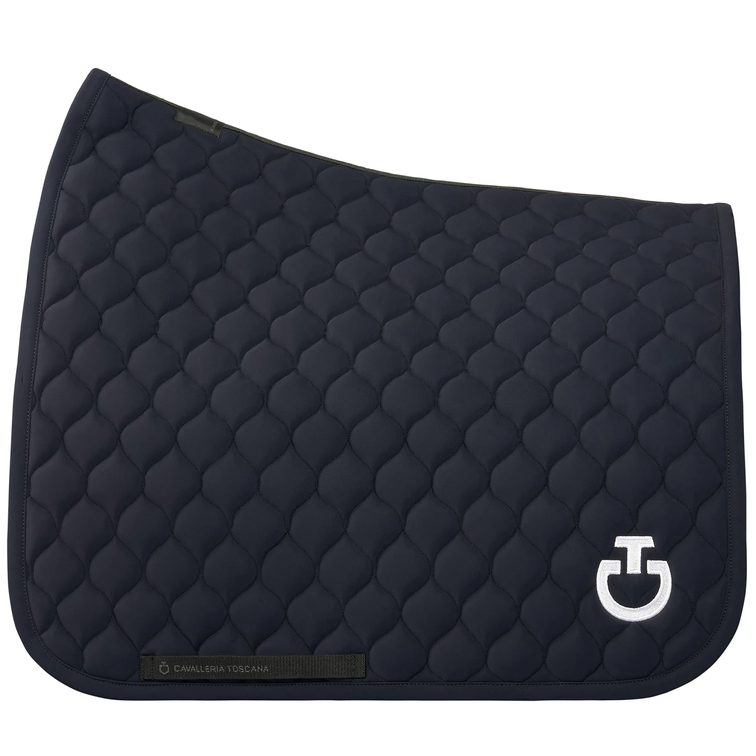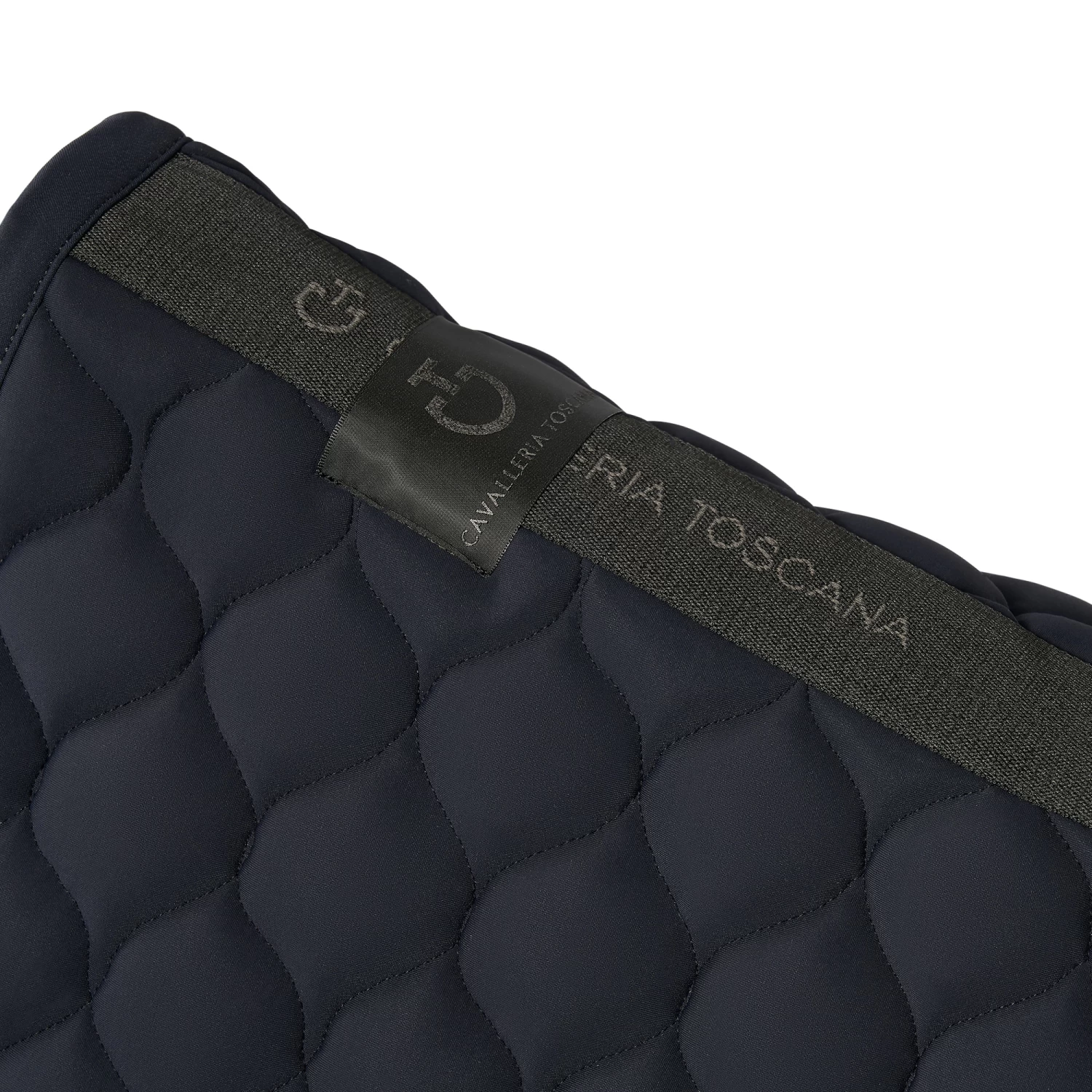 This dressage saddle pad from Cavalleria Toscana is stylish and elegant with smaller, quilted circles. Circular Quilted Jersey Dressage Saddle Pad has an elegant navy color and a white CT logo on the side and a black channel in the back with Cavalleria Toscana logo there also.