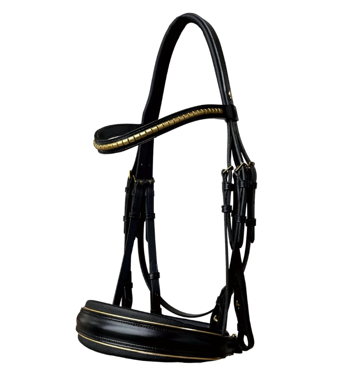 The black Comfort XS double bridle has an anatomically narrow neck piece that is designed to be extra soft to have a softer fit against the horse’s neck. In combination with the Comfort XS noseband with extra soft padding and gold piping, this becomes a pretty, super elegant and comfortable bridle.