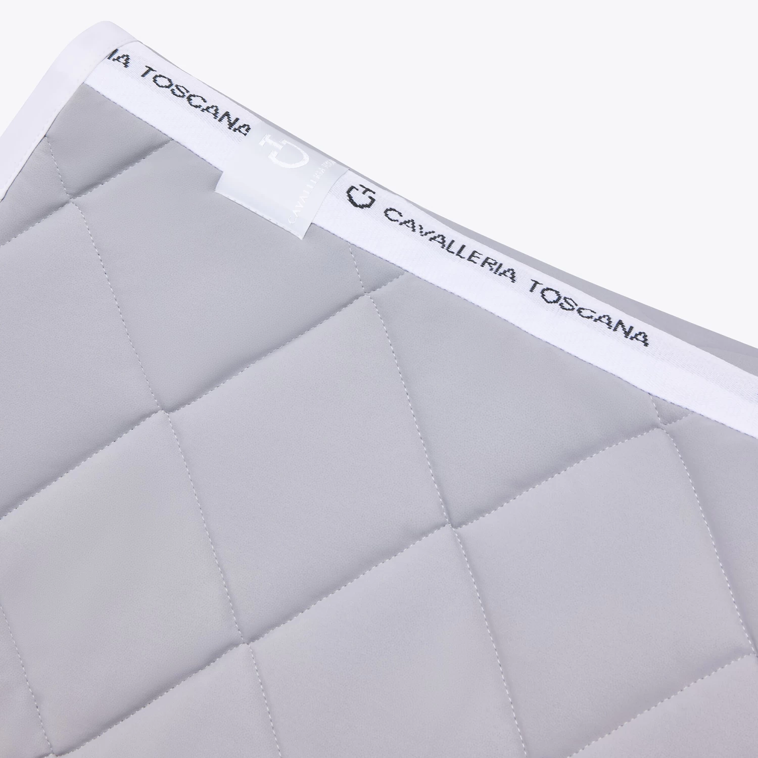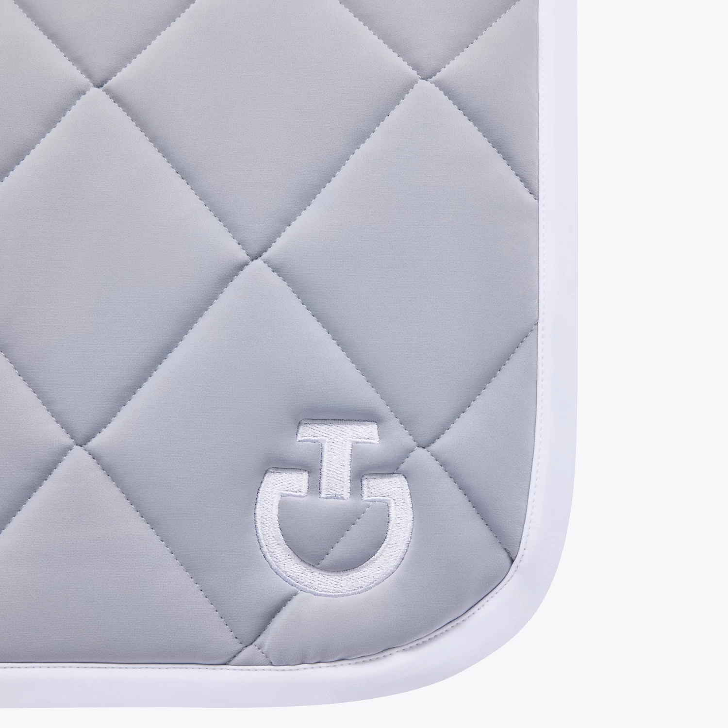 DQ Jersey Jumping Saddle Pad from Cavalleria Toscana is super nice with big, quilted squares. This saddle pad is in a beautiful light grey color with a white CT logo on the side and a white channel.