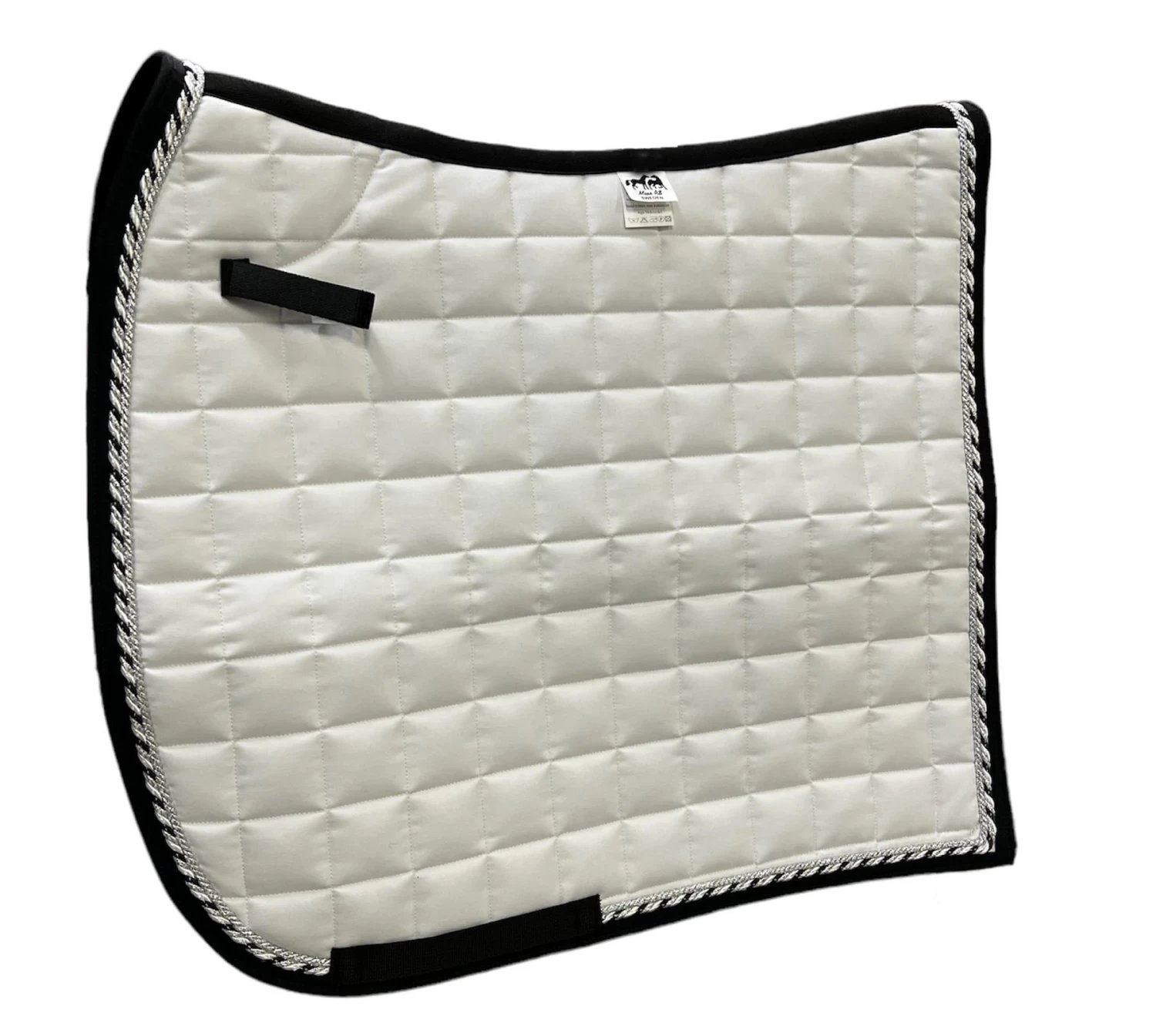 This dressage saddle pad is in a beautiful white color with large quilting and two pipings, one in silver and one in black/silver glitter/white.