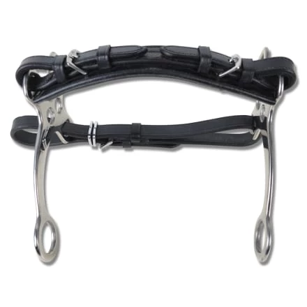 Short shanks and leather noseband. Because of its leverage effect across the bridge of the horse’s nose, the hackamore should only be used by experienced riders. Available in black, size Horse and Pony.