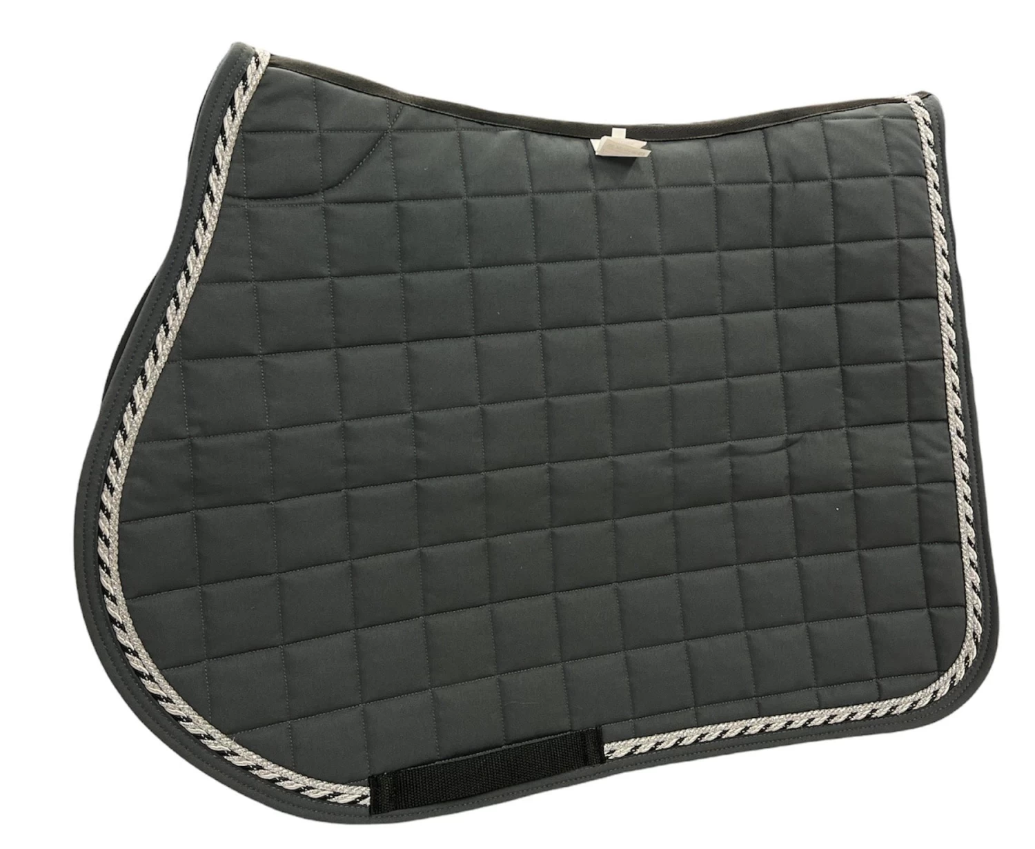 The jumping saddle pad is made of cotton with soft teddy at the withers to prevent chafing. This saddle pad has a nice grey colour with two spinners, one in silver glitter and one in black, silver and white.