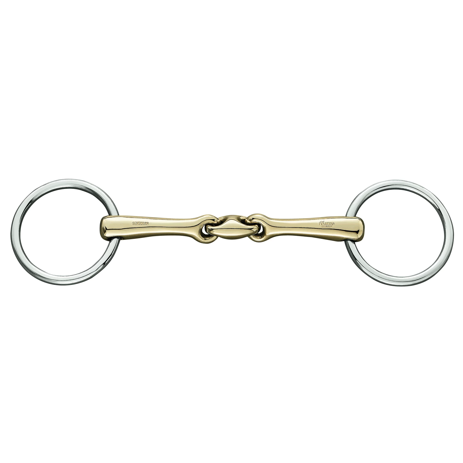 Compared to conventional bits, the middle link has also been shortened. The anatomical adaption noticeably optimises the effect compared to conventional double jointed bits. When the reins are taken up, the middle link gently rolls over the centrel part of the horse’s tounge, stimulating its sense of touch. The connecting rings to the middle piece roll softly over the tounge without exerting pressure.