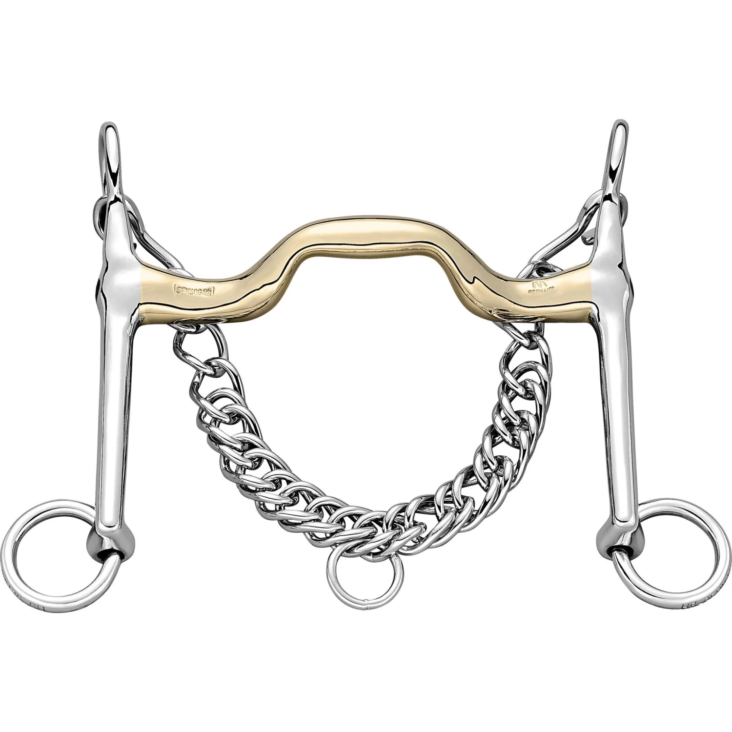 As the horse’s mouth narrows downwards and the bridoon bit is placed below the weymouth bit, Sprenger recommends that the weymouth bit should be 0.5 to 1 cm shorter than the bridoon and that the shanks of the weymouth bit should be close to the horse’s mouth for best stability and impact.