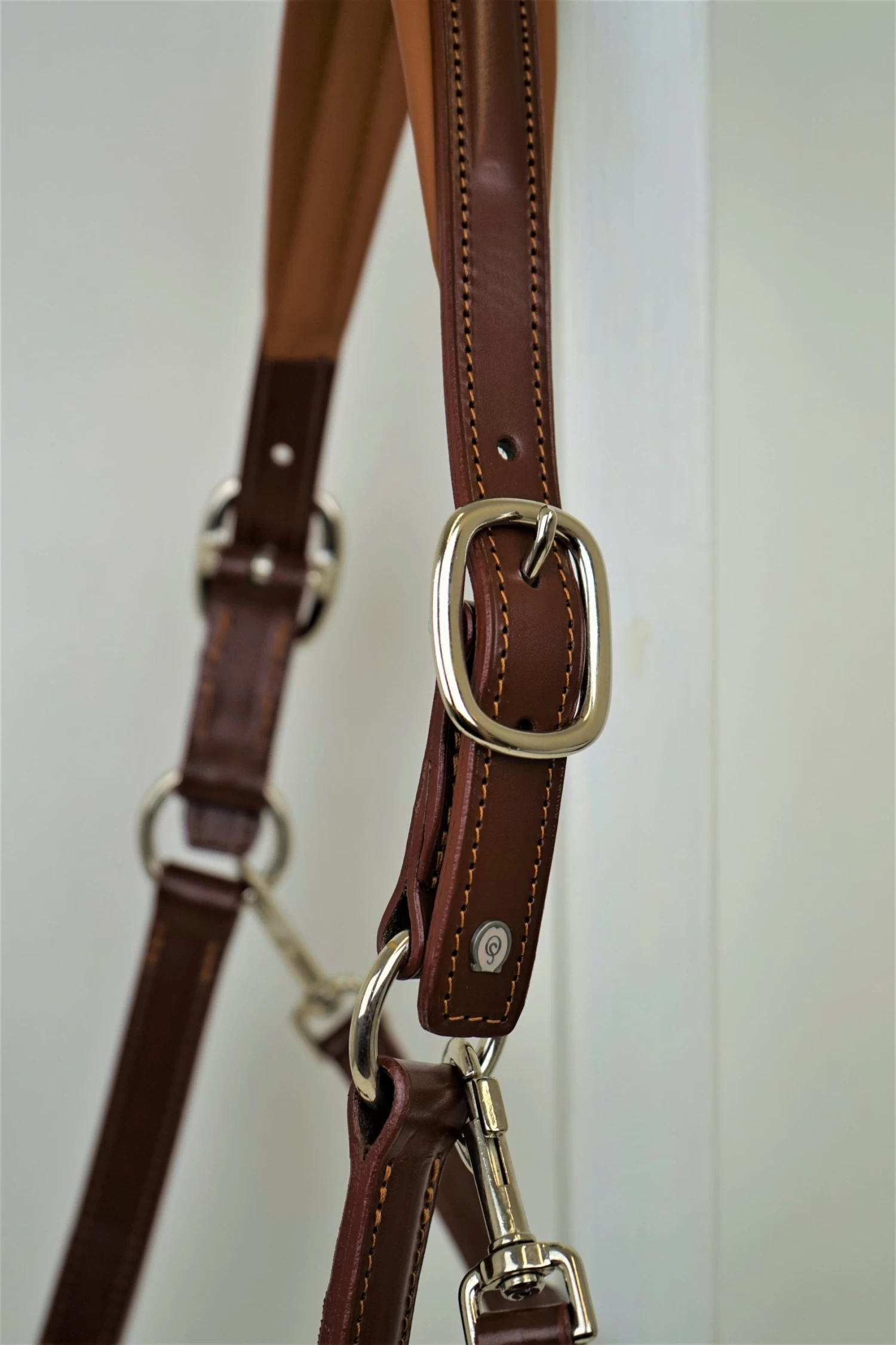 This halter is made of wide leather straps with soft padding across the poll and nose in a beautiful havanna colour with hardware in stainless steal.