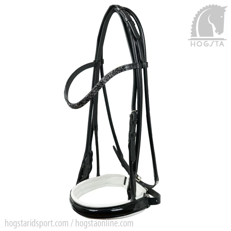 This round- sewn double bridle has a 4 cm wide lacquered noseband with soft white padding, buttoned back closure. The browband is beautifully arched with Swarovski Crystal Rock (crushed stones).