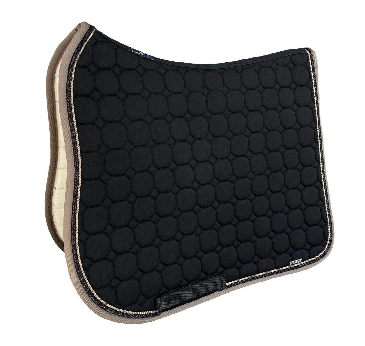 Very nice black dressage saddle pad, octagon quilted from Equiline, with beige edge and black glitter piping and a thinner beige piping.