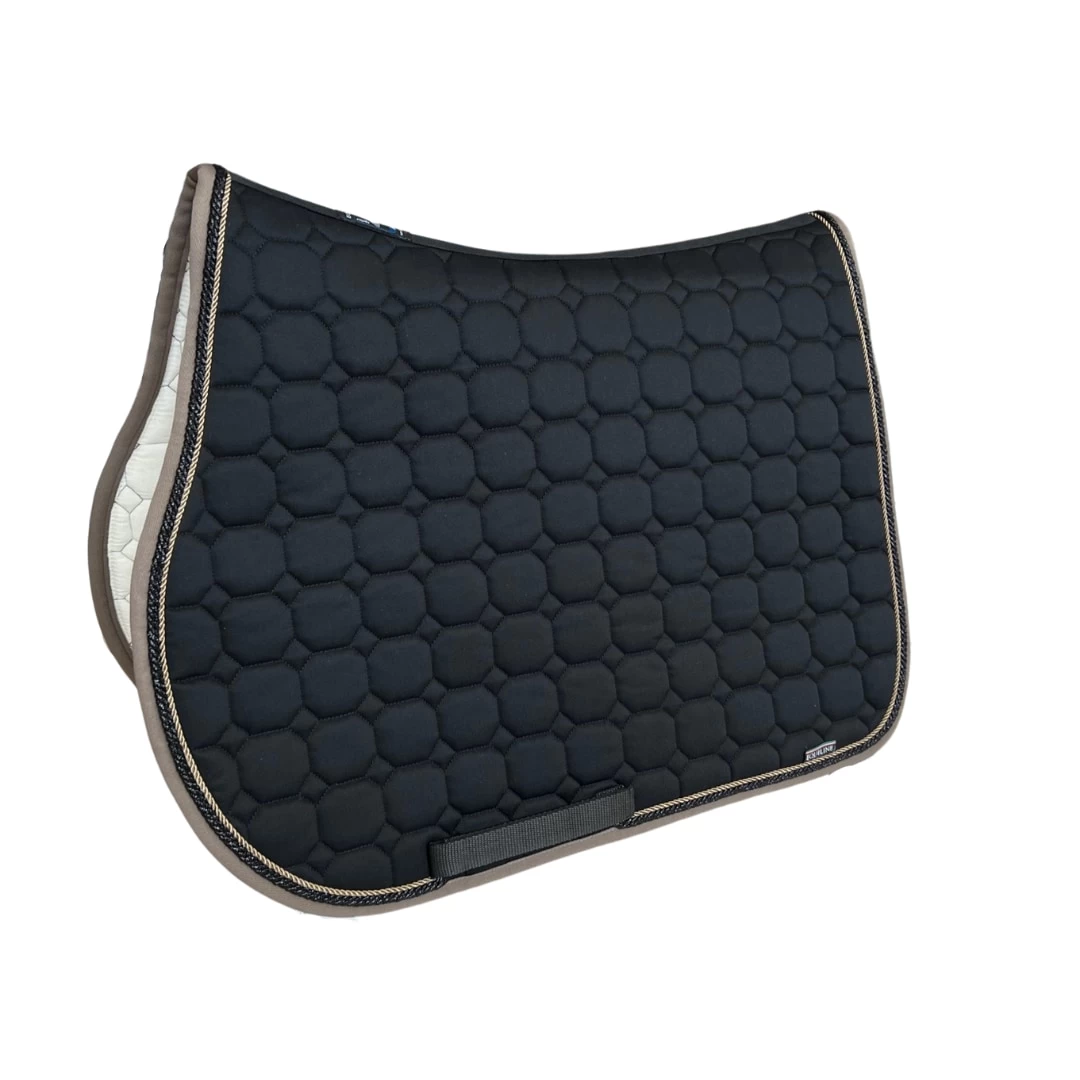 Very nice black jumping saddle pad, octagon quilted from Equiline, with beige edge and black glitter piping and a thinner beige piping.