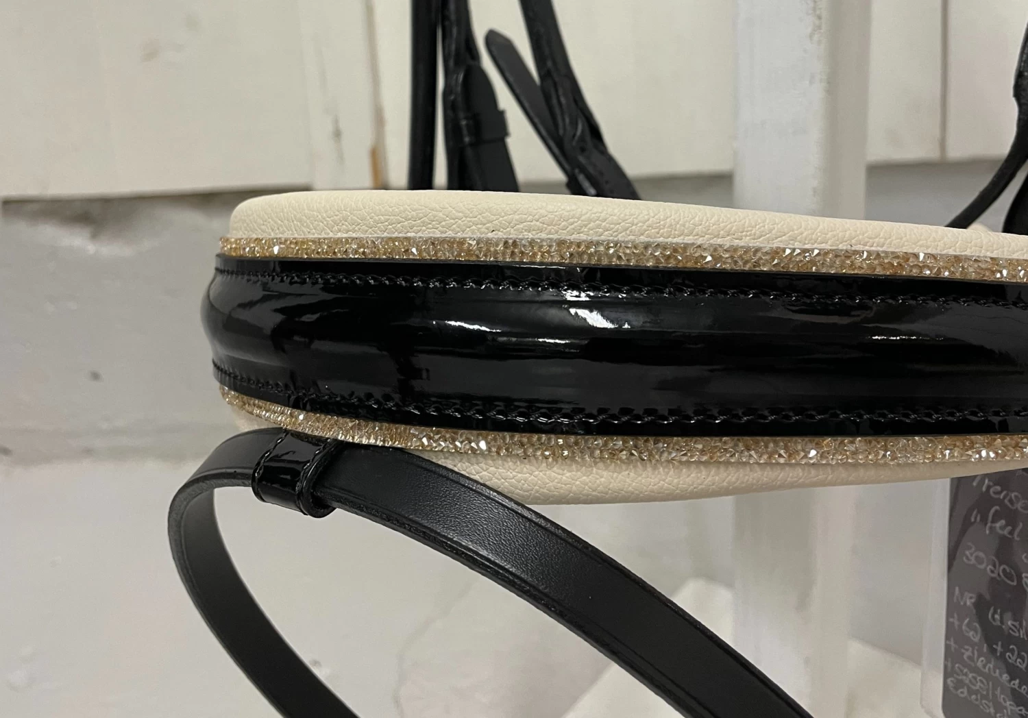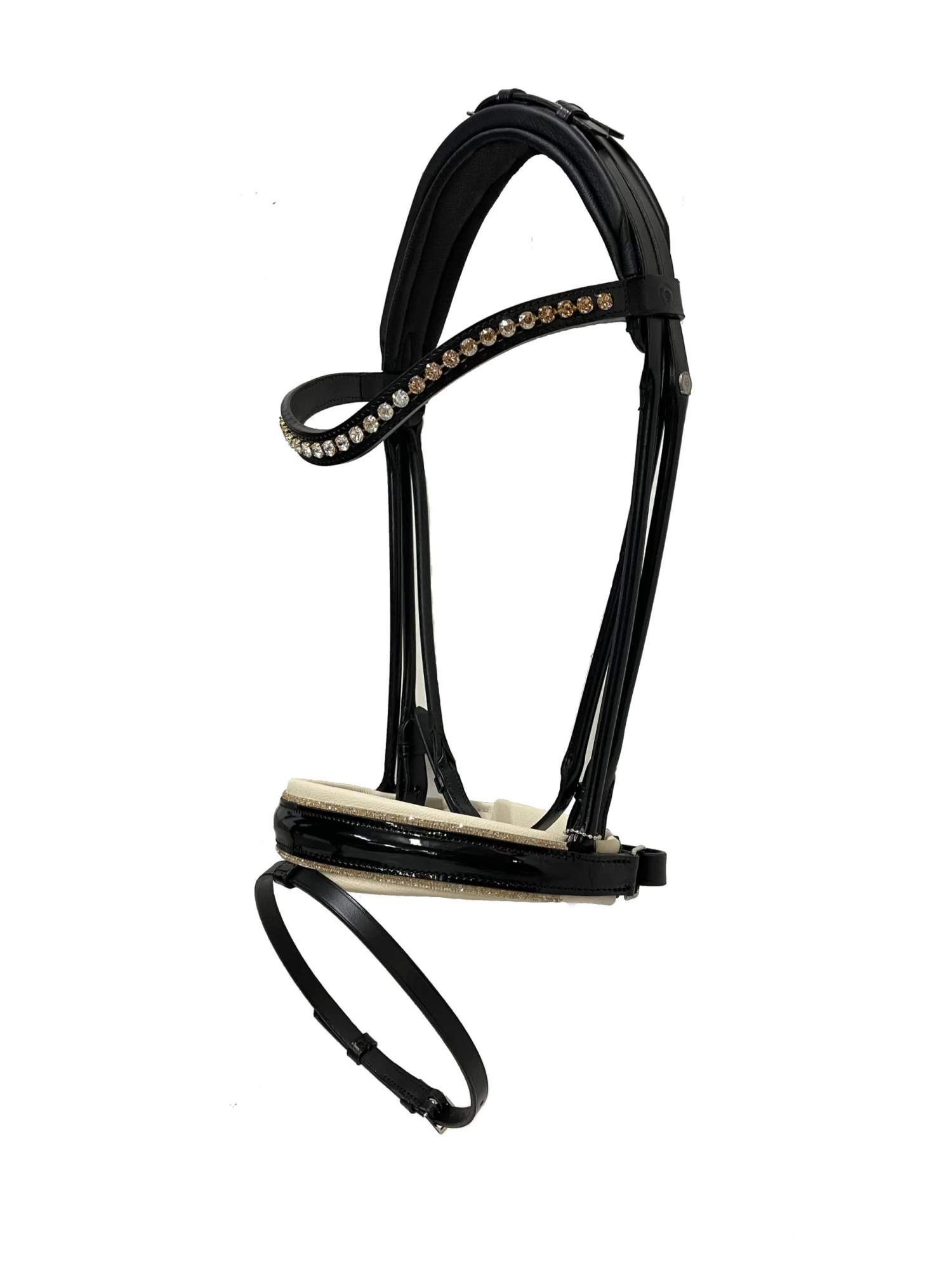 This is a black München Feel Good round-sewn bridle with the slightly wider, well-padded neck piece, which is specifically named Feel Good because it has a softer setting against the horse’s neck. The noseband on this round-sewn bridle is 5 cm wide in the Comfort XS model, which means that the noseband is narrower at the sides where the horse has the least space at the bit, the closure of the noseband is pull-back. The noseband is lacquered and has Swarovski fineline decoration, is softly padded with a light silky color that is exceptionally beautiful against a light fux or palomino.