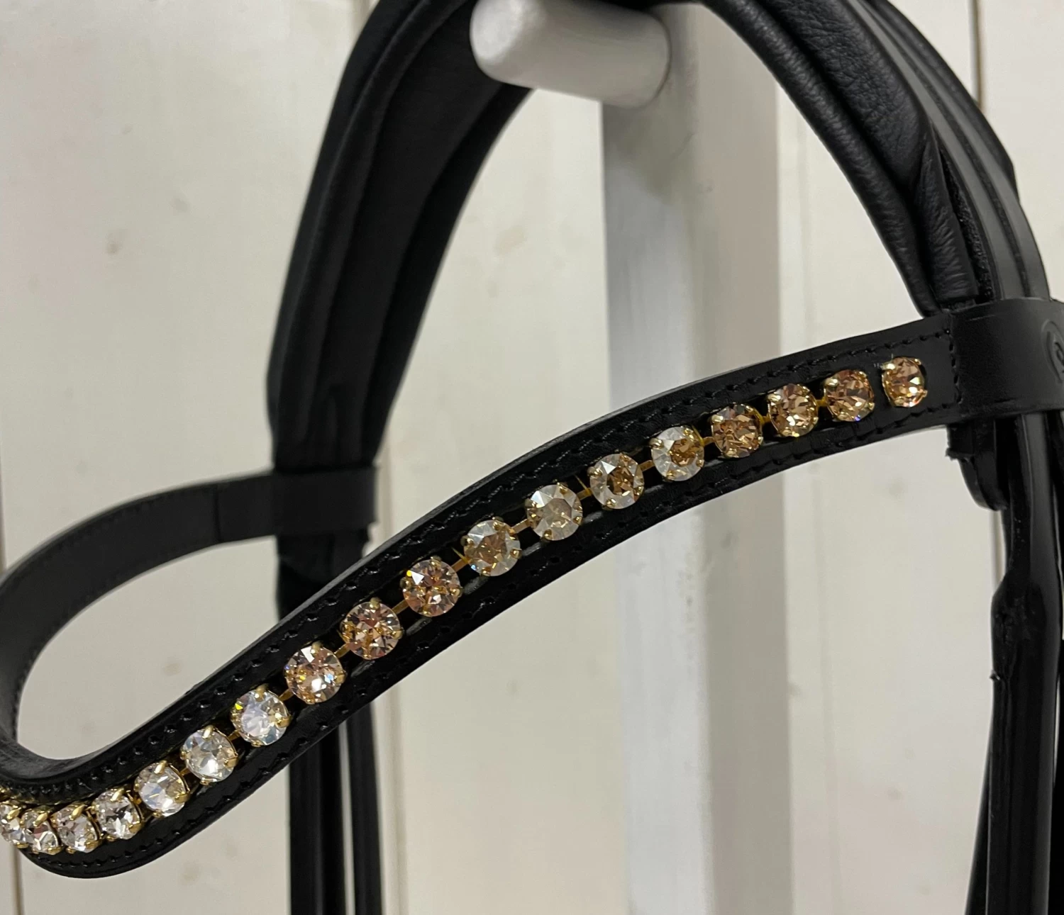 This beautiful bridle has a classic bow-shaped browband with Swarovski stones in shading topaz.
