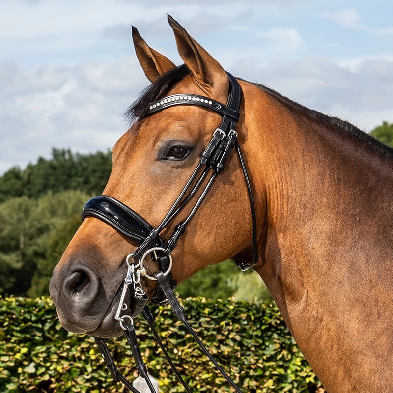 This rolled leather double bridle from Dy’on comes with many advanced features such as the ergonomic design, extra wide noseband that tapers off and curves at the sides to reduce the risk of pinching between the bit and noseband and the crank noseband fastening. The anatomic design headpiece provides added space around the ears whilst the cheek pieces are attached to the noseband sides for extra comfort. In addition, the headpiece feature neoprene padding and a soft sheep leather lining (without the fleece). The diamond browband comes as standard with this bridle. Available in Black or Brown, with or without a shiny patent finish and with a matching coloured or white padded noseband. Reins not included.