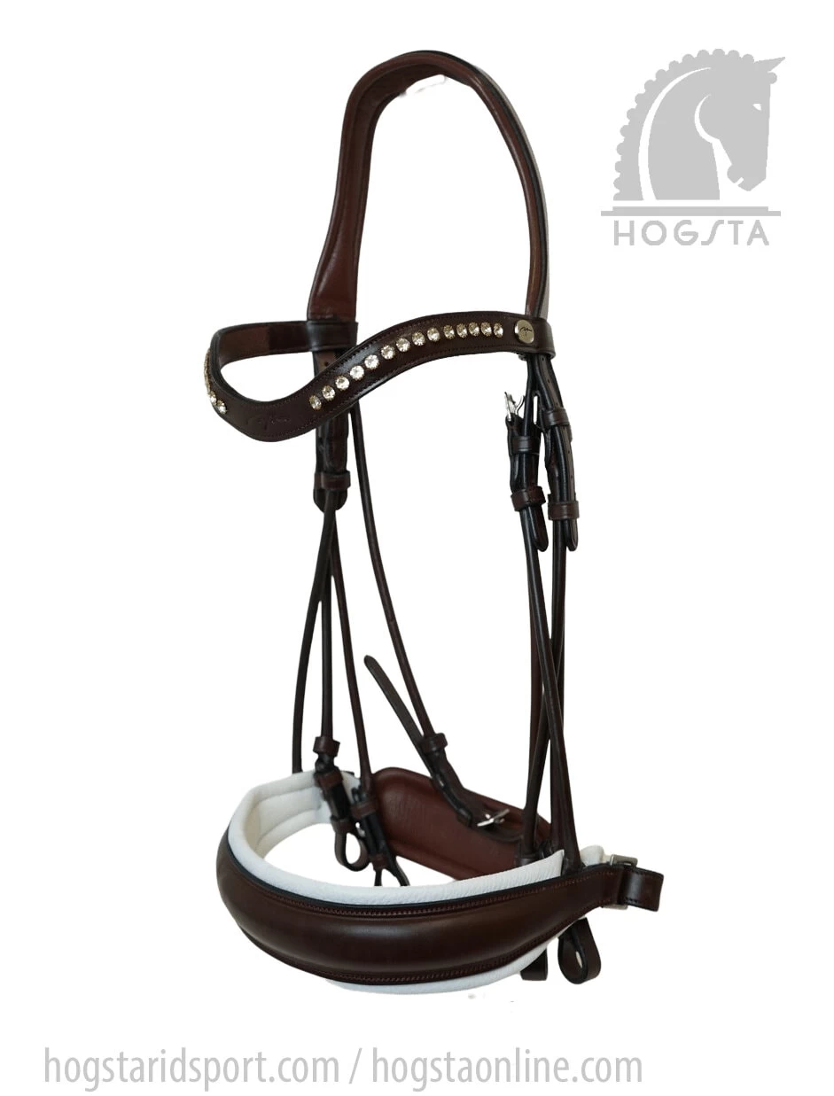This rolled leather double bridle from Dyón comes with many advanced features such as the ergonomic design, extra wide noseband that tapers off and curves at the sides to reduce the risk of pinching between the bit and noseband and the crank noseband fastening. The anatomic design headpiece provides added space around the ears whilst the cheek pieces are attached to the noseband sides for extra comfort. In addition, the headpiece feature neoprene padding and a soft sheep leather lining (without the fleece). The diamanté browband comes as standard with this bridle. Available in Black or Brown, with or without a shiny patent finish and with a matching coloured or white padded noseband. Reins not included.