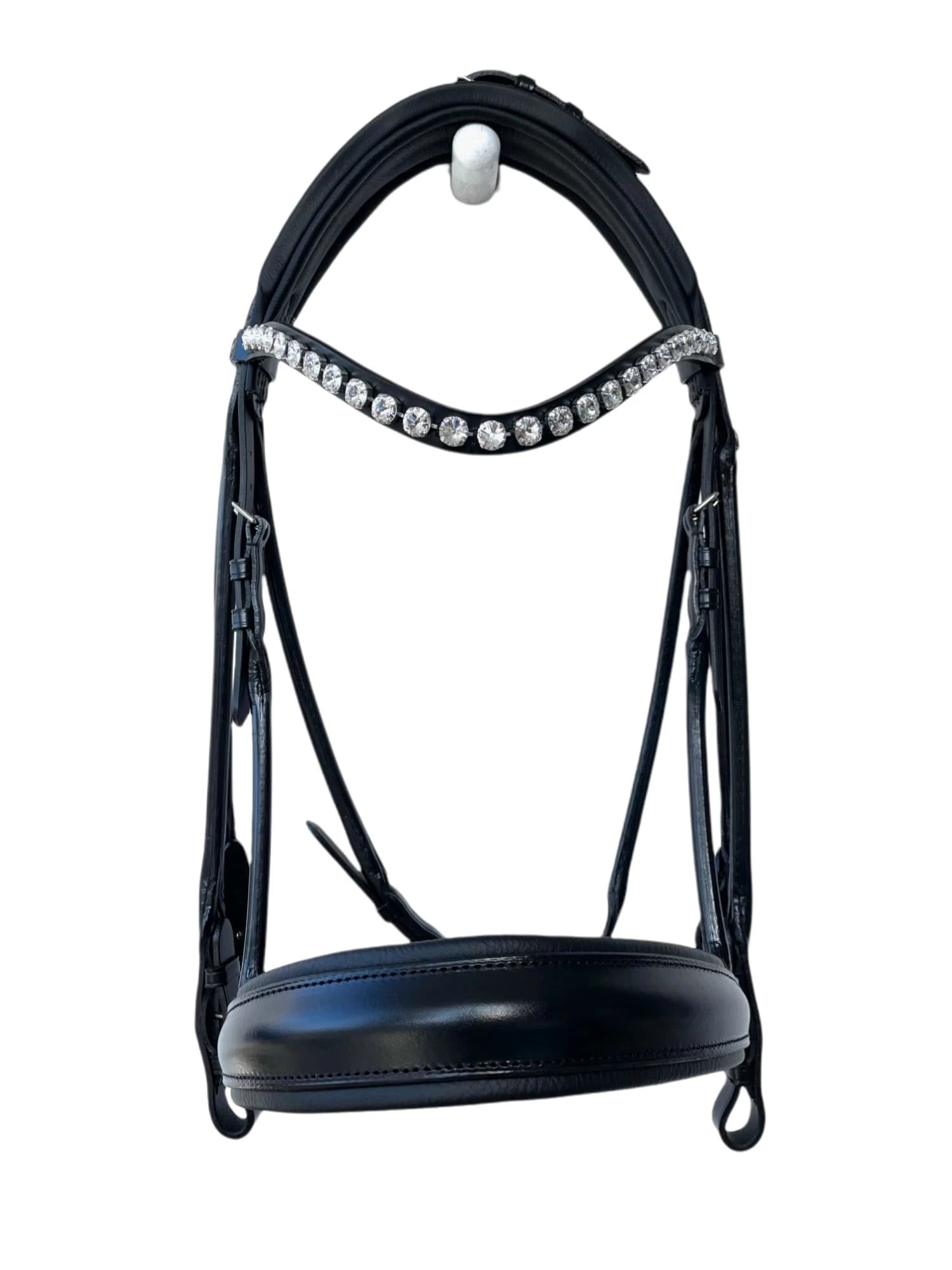 The browband on this double bridle is curved and adorned with swarowski stones which gives a luxurious feeling, the swarowski stones are 10 mm big in the color Rivoli Crystal. All buckles on this double bridle are silver colored.