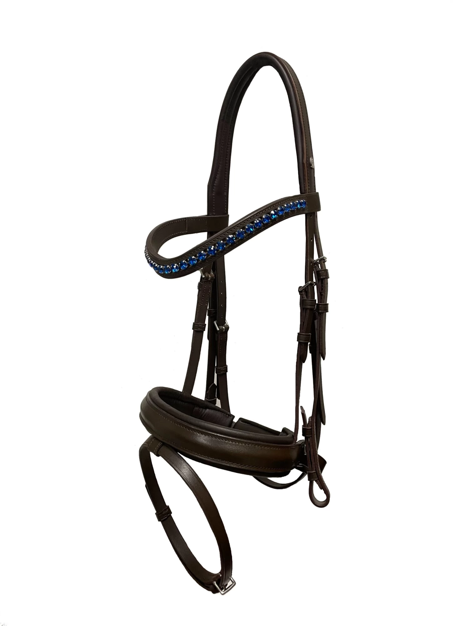 The bridle comes with a 4 cm wide crank noseband. Softly padded noseband and headpiece in the same colour as the bridle. Cut away headpiece that allows more room for the horse’s ears. A beautiful curved browband embellished with Swarovski crystals clear.