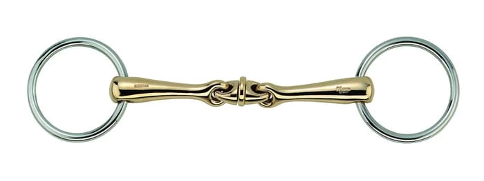 The bradoon bit is made in Sensogan (Sensogan is a material from Sprenger made on copper, manganiese and zinc for reduced oxidation and better well-being) and is 16 mm thick, with loose rings with 55 mm diameter, can also be used as a single bit as the difference is only the size of the loose rings.